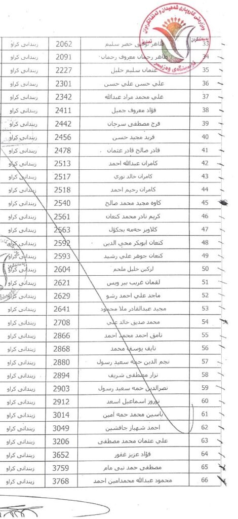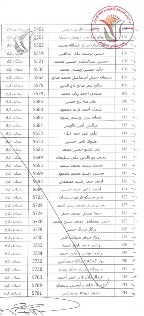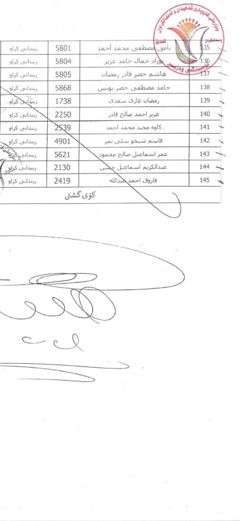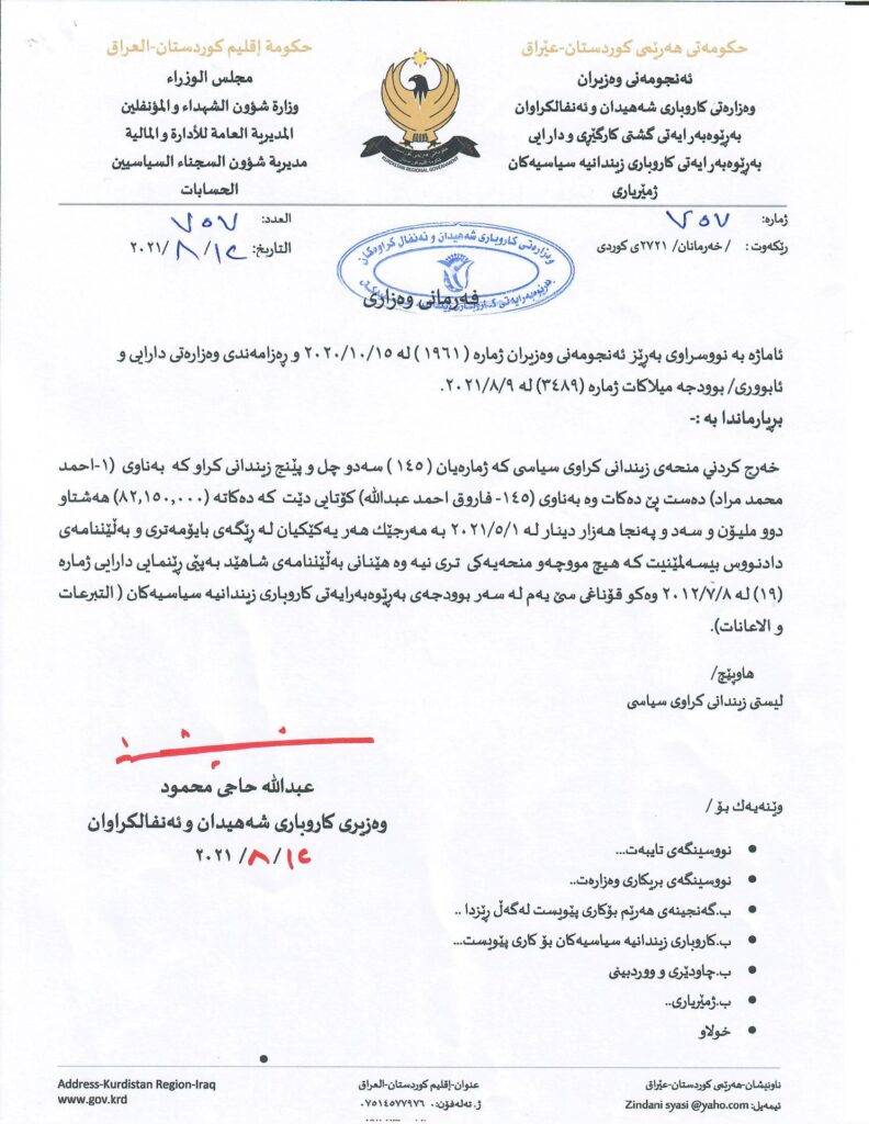 ئهمڕۆ پێنجشهمه 12 ى 8 ى 2021 ، له راگهیاندراوێكدا، لیستی ناوی 145 زیندانی و گیراوی سیاسی بڵاوكردهوه ، كه واژووی عهبدوڵڵای حاجی مهحمود وهزیری كاروباری شههیدانی لهسهره و رایدهگهێنێت: دوا بەدوای فەرمانمان ژمارە (757) لە رێکەوتی 12/8/2021 تایبەت بە خەرجکردنی منحەی (145) زیندانیکراو و گیراوی سیاسی وەک قۆناغی سێیەم، ئەو بەرێزانەی رێکارەکانی بایۆمەترى و بەڵێنامەی دادنووسیان تەواوکردووە لە کاتی ڕاگەیاندنی خشتەی مووچەی وەزارەتی کاروبارى شەهیدان و ئەنفالکراوان سەردانی بانکی بێخاڵ بکەن لە هەولێر بە مەبەستی وەرگرتنی منحەی مانگی ئایار و حوزەیرانی 2021.