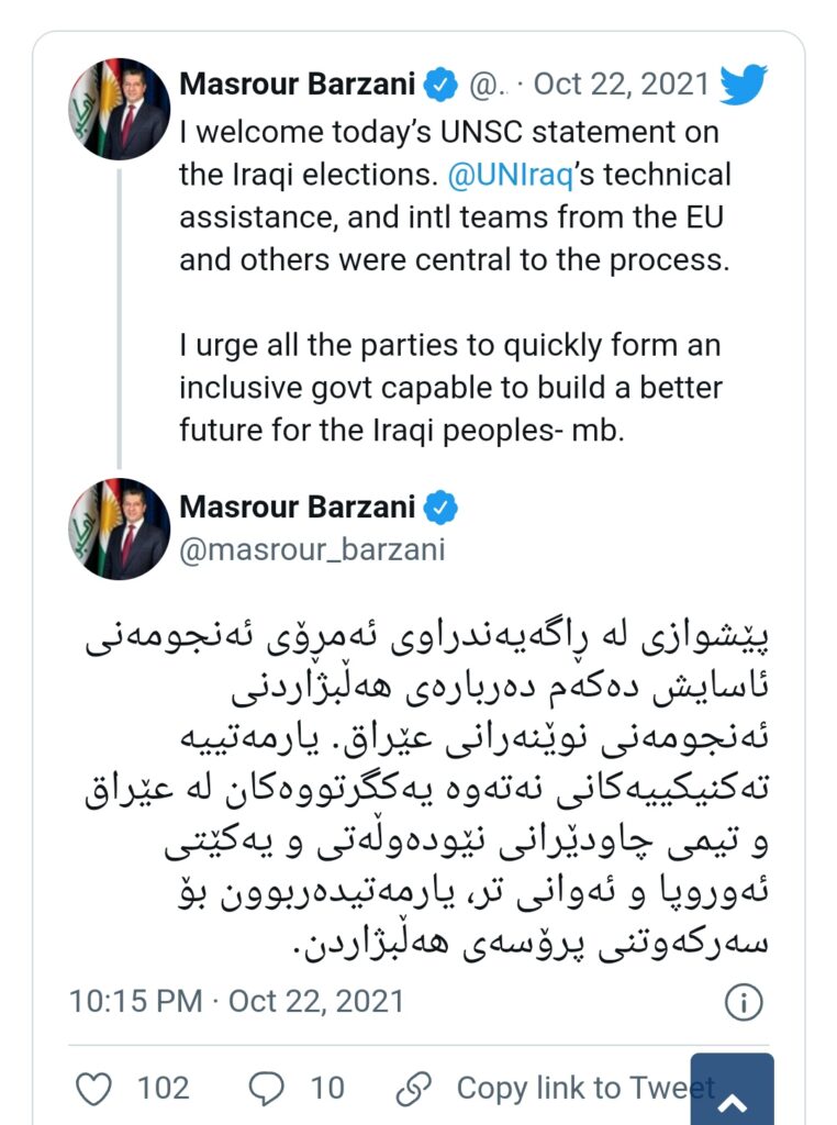 له تویتهكهی مهسرور بارزانیدا هاتووه: “پێشوازی لە راگەیەندراوی ئەمڕۆی ئەنجومەنی ئاسایش دەکەم دەربارەی هەڵبژاردنی ئەنجومەنی نوێنەرانی عێراق”.