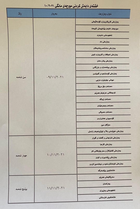 بەگوێرەی ئەو لیستە بێت كە وەزارەتی دارایی بڵاویكردووەتەوە لەماوەی سێ رۆژداو تا 11-11-2021 مووچەی سەرجەم وەزارەتەكان و خانەنشینان دابەشدەكرێت.