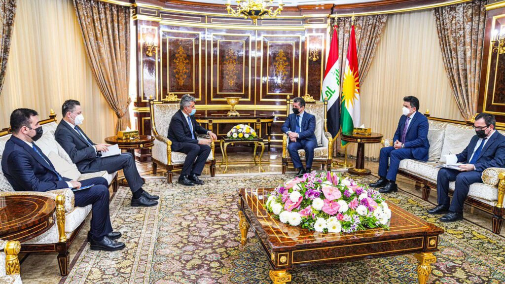 مەسرور بارزانی، سەرۆکی حکومەتی هەرێمی کوردستان، ئەمڕۆ یەکشەممە (28ی تشرینی دووهم/ نۆڤێمبەری 2021) پێشوازی لە “برونۆ ئەنتۆنیۆ”، باڵیۆزی ئیتالیا لە عێراق کرد، کە بە بۆنەی کۆتایی هاتنی ئەرکەکانی سەردانی کردبوو.