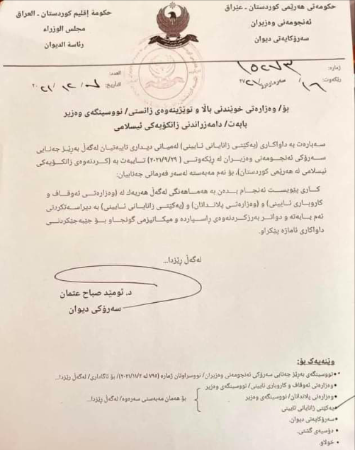 بەپێی نووسراوێکی سەرۆکایەتی دیوانی ئەنجوومەنی وەزیران کە کۆپییەکی بە (باسنیوز) گەیشتووە و ئاراستەی وەزارەتی خوێندنی باڵا کراوە و تێیدا هاتووە: “سەبارەت بە داواکاری (یەکێتی زانایانی ئایینی) لە میانی دیداری تایبەتیان لەگەڵ سەرۆکی ئەنجوومەنی وەزیران لە 29/9/2021، تایبەت بە (کردنەوەی زانکۆیەکی ئیسلامی لە هەرێمی کوردستان) بۆ ئەم مەبەستە لەسەر فەرمانی سەرۆکی حکوومەت کاری پێویست ئەنجام بدەن بە هەماهەنگی لەگەڵ هەر یەک لە وەزارەتەکانی ئەوقاف و کاروباری ئایینی، وەزارەتی پلاندانان و یەکێتی زانایانی ئایینی بە دیراسەتکردنی ئەم بابەتە و دواتر بەرزکردنەوەی راسپاردە و میکانیزمی گونجاو بۆ جێبەجێکردنی داواکاری ئاماژە پێکراو”.