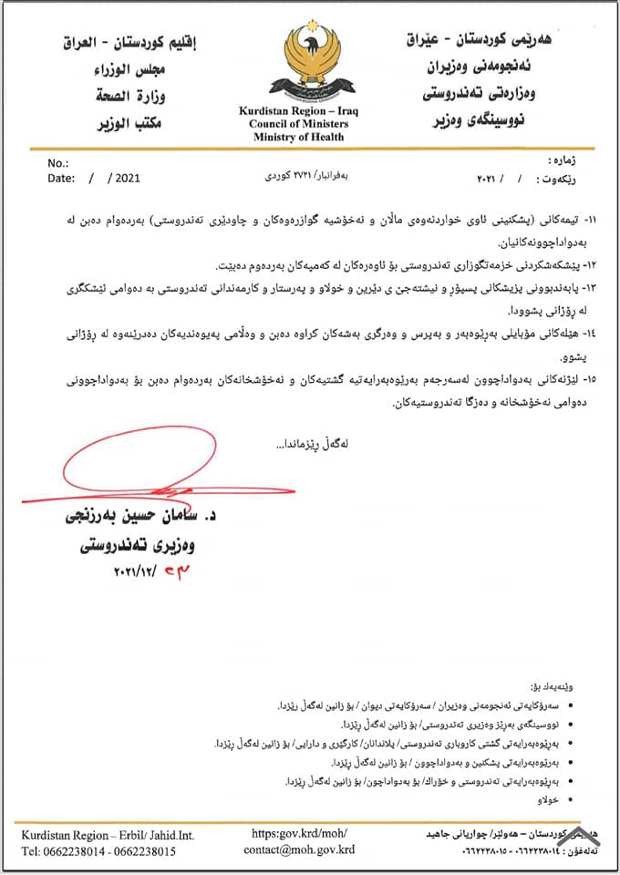 پازدهیهم: لیژنهكانی بهدواداچون لهسهرجهم بهرێوهبهرایهتیه گشتیهكان و نهخۆشخانهكان بهردهوام دهبن بۆ بهدواداچونی دهوامی نهخۆشخانه و دهزگا تهندروستیهكان