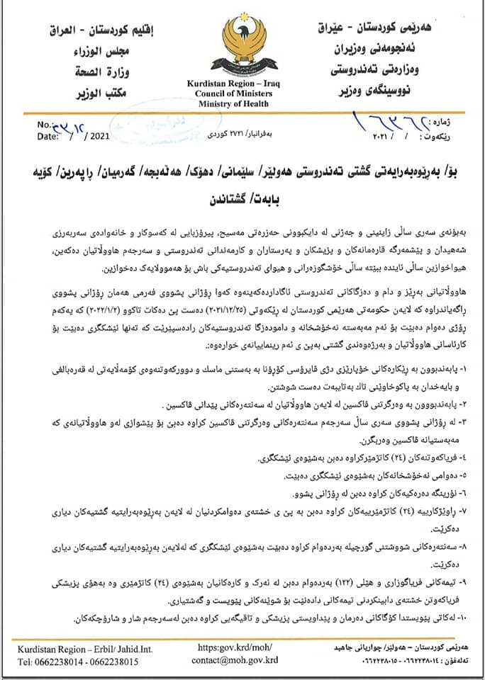 سێیهم: له ڕۆژانی پشوی سهری ساڵ سهرجهم سهنتهرهكانی وهرگرتنی ڤاكسین كراوه دهبن بۆ پێشوازی لهو هاوڵاتیانهی كه مهبهستیانه ڤاكسین وهربگرن.