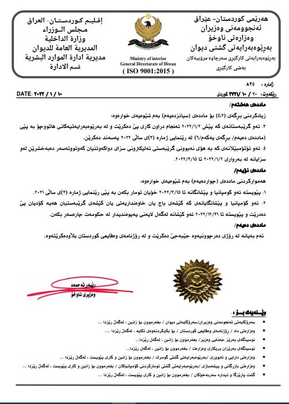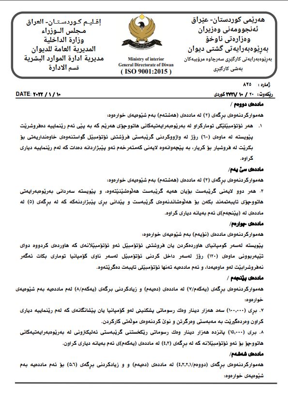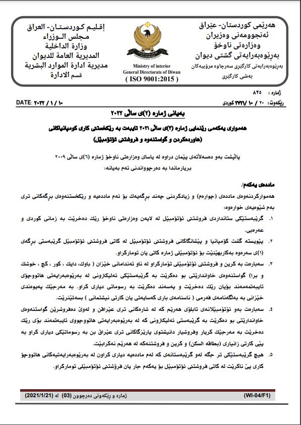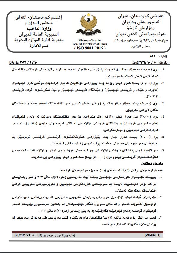 وه‌زاره‌تی ناوخۆی حكومه‌تی هه‌رێمی كوردستان رێنمایی ژماره‌ 3ی ساڵی 2021ی تایبه‌ت به‌ رێكخستنی كاری كۆمپانیاكانی هاورده‌كردن و گواستنه‌وه‌ و فرۆشتنی ئۆتۆمبێلی هه‌موار كرده‌وه‌.