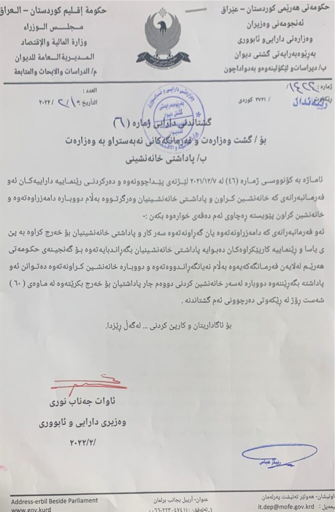 وەزارەتی دارایی ھەرێم نوسراوێکی سەبارەت بە پاداشتی خانەنشینی بڵاوکردەوە.