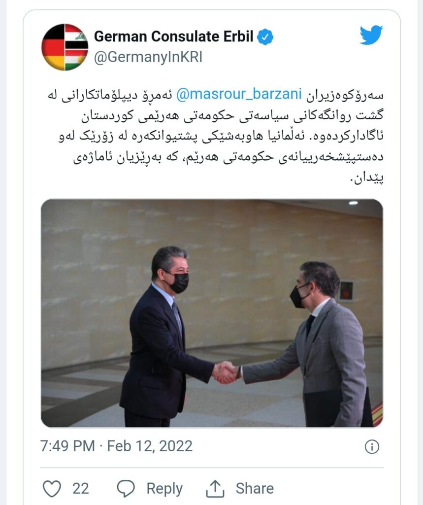 کونسوڵخانەی ئەڵمانیا لە هەژماری فەرمی خۆی لە تۆڕی کۆمەڵایەتیی (تویتەر) بڵاویکردووەتەوە: “مەسرور بارزانی، سەرۆک وەزیرانی هەرێمی کوردستان، ئەمڕۆ دیپلۆماتکارانی لە گشت روانگەکانی سیاسەتی حکوومەتی هەرێمی کوردستان ئاگادارکردەوە”.
