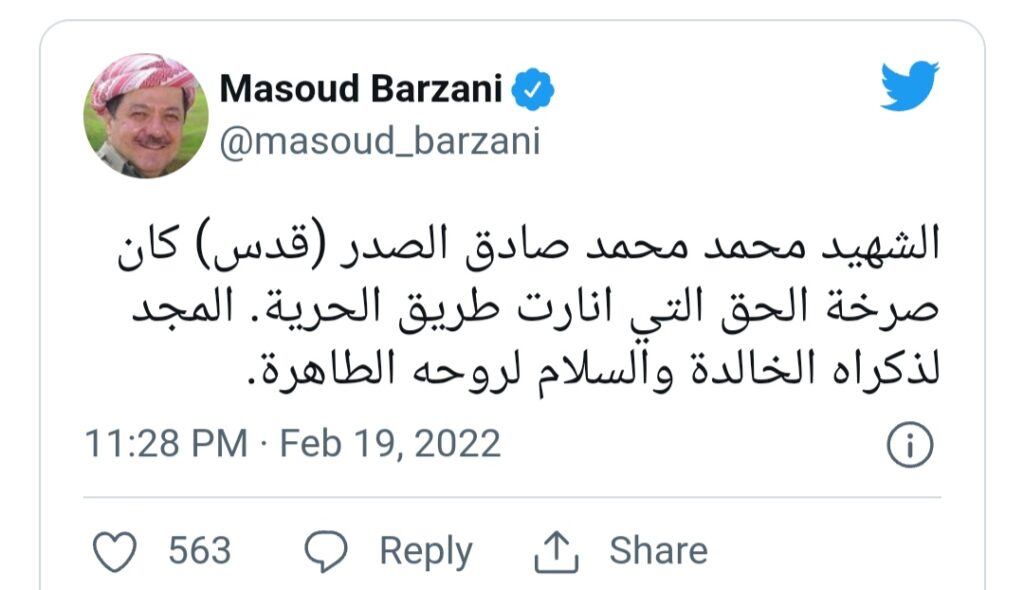 سهرۆك بارزانی، له ههژماری تایبهتی خۆی له تۆڕی كۆمهڵایهتی تویتهر رایگهیاند، شههید محهمهد محهمهد سادق سهدر، دهنگی بهرزی راستی بوو، بۆ رووناك كردنهوهی رێگهی ئازادی.