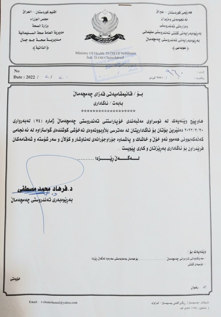 بەڕێوەبەرایەتیی تەندروستیی چەمچەماڵ رایگەیاندووە، لەژێر رۆشنایی نووسراوی مەڵبەندی خۆپاراستنی تەندروستیی چەمچەماڵ، “لایەنە پەیوەندیدارەکانی سنوورەکە لە مەترسیی بڵاوبوونەوەی نەخۆشیی کوشندەی گواستراوە ئاگاداردەکەینەوە لە ئەنجامی کەڵەکەبوونی خۆڵ و خاشاک و ئەو پاشماوە جۆراوجۆرانەی لەناو شار و کۆڵان و سەر شۆستە و شەقامەکان فڕێدراون”.