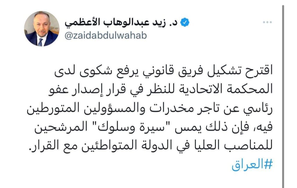 دكتۆر زهید له تویتهكهیدا نووسیویهتی: “پێشنیازی پێكهێنانی لیژنهیهكی یاسایی دهكهم، بۆ بهرزكردنهوهی سكاڵا بۆ دادگای فیدراڵ، بۆ ئهوهی پێداچوونهوه بۆ بڕیاری دهركردنی لێبووردنی سهرۆكایهتی له بازرگانێكی مادده هۆشبهرهكان و بهرپرسه تێوهگراوهكان لهو كهیسه بكهن”.