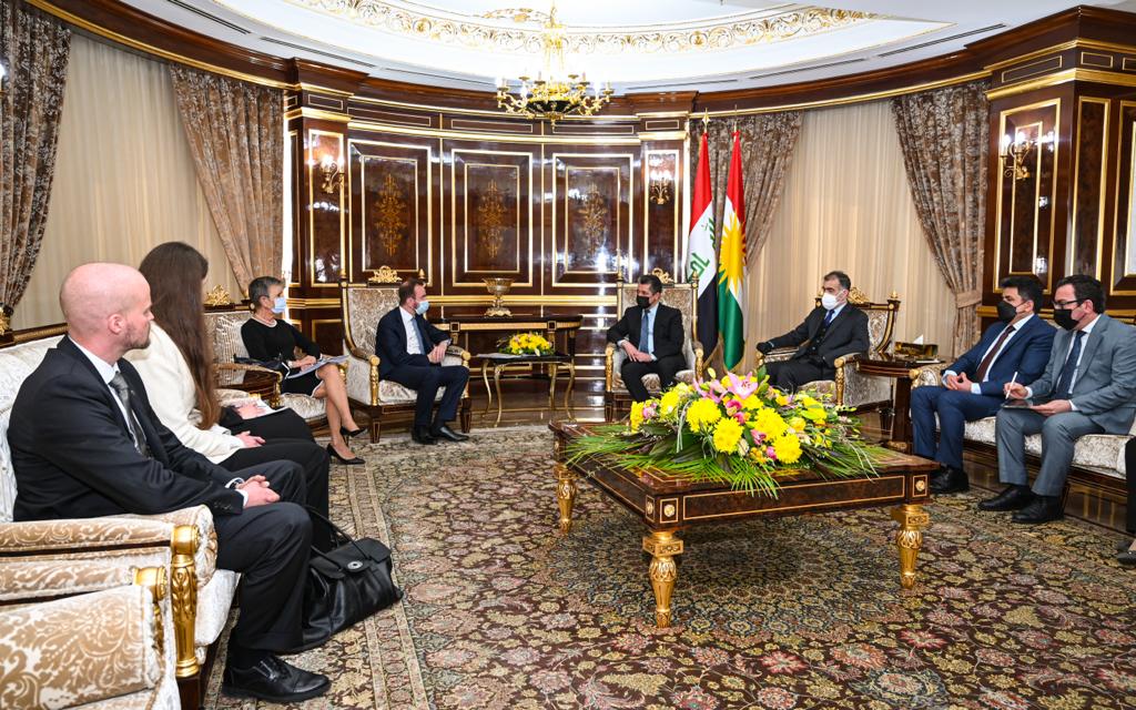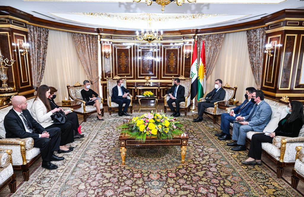 ئهمڕۆ سێشهممه 15ی ئاداری 2022 مەسرور بارزانی سهرۆكى حکومەتی ههرێمى كوردستان، پێشوازى له شاندێکی یەکێتیی ئەوروپا کرد کە لە ڤيلله ڤاريۆلا باڵيۆزى يهكێتيى ئهوروپا لە عێراق و ئان مێسكانهن سهرۆكى نێردهى ڕاوێژكاريى يهكێتيى ئهوروپا له عيراق و بەرپرسی نووسینگەی یەکێتیی ئەوروپا لە هەولێر و ژمارەیەک ڕاوێژکار پێکهاتبوون.