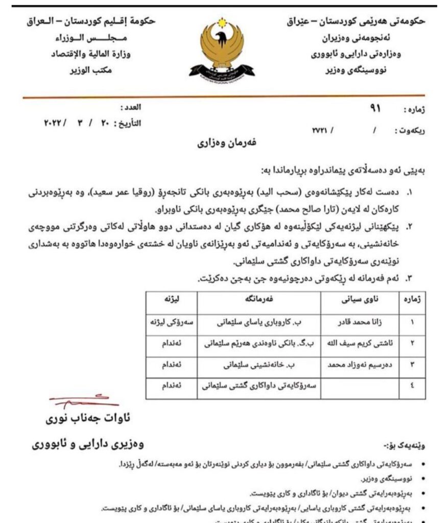 ئاوات جەناب نووری، وەزیری دارایی هەرێمی کوردستان رایگەیاند، “بەپێی ئەو دەسەڵاتەی پێماندراوە بڕیارماندا بە دەستلەکار پێکێشانەوەی بەڕێوەبەری بانکی تانجەرۆ (روقیە عومەر سەعید) و بەڕێوەبردنی کارەکانی لەلایەن (تارا ساڵح محەممەد) جێگری بانکەکە.