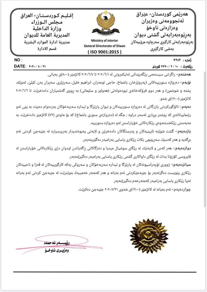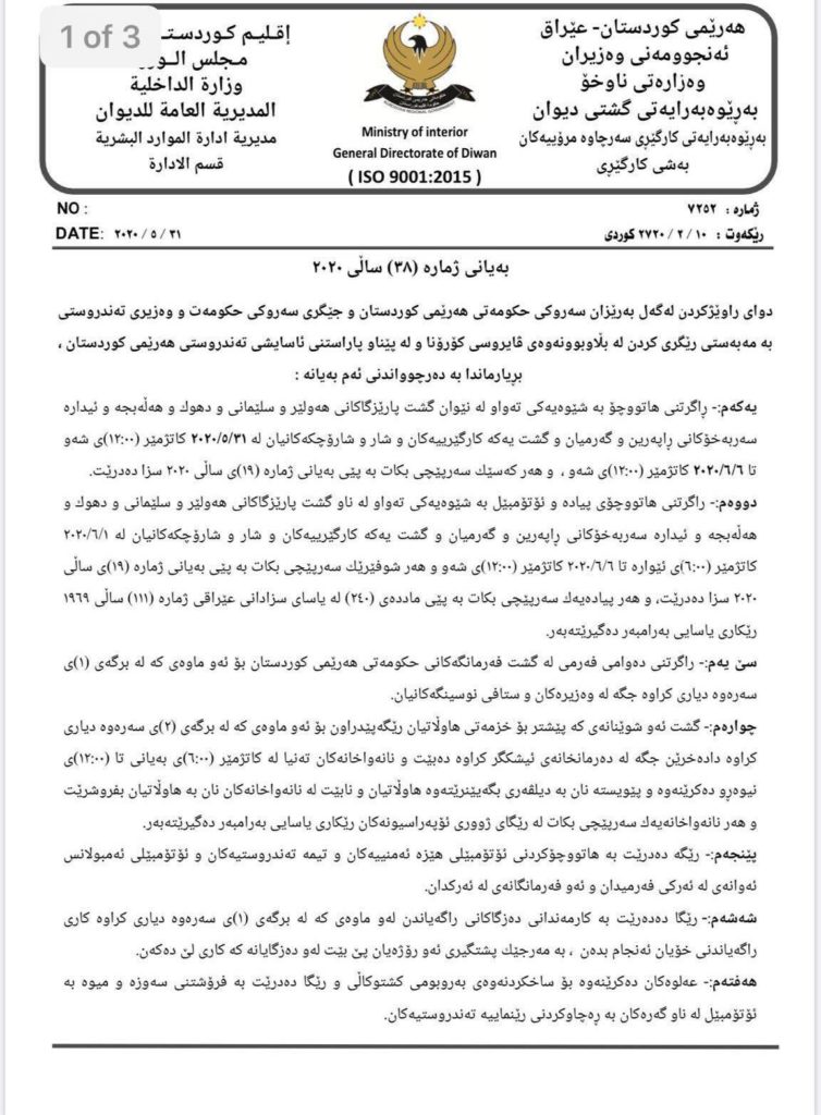 وەزارەتی ناوخۆی حکوومەتی هەرێمی کوردستان درەنگانی شەوی(٣١-٥-٢٠٢٠) بەیانی ژمارە ٣٨ی ساڵی٢٠٢٠ی دەرکرد و تیایدا بە هەشت بڕیاری تازە لەبارەی ڤایرۆسی کۆرۆناوە دراوە.