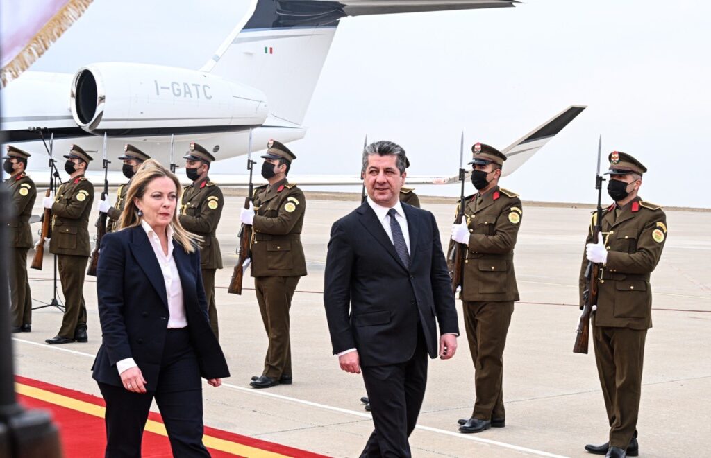 مەسرور بارزانی سەرۆکی حکوومەتی هەرێمی کوردستان، ئەمڕۆ هەینی 23ـی 12ـی 2022 لە ڕێورەسمێکی تایبەتدا لە فڕۆکەخانەی نێودەوڵەتیی هەولێر، پێشوازی لە جۆرجیا مێلۆنی سەرۆک وەزیرانی ئیتاڵیا کرد.