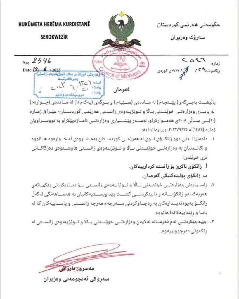 بە بەرمانی ژمارە (2546) لە 19ـی حوزەیرانی 2023)، مەسرور بارزانی، سەرۆکی حکومەتی هەرێمی کوردستان فەرمانی دەکردووە بە دامەزراندنی دوو زانکۆی نوێ لە هەرێمی کوردستان و لکاندنیان بە وەزارەتی خوێندنی باڵا و توێژینەوەی زانستیی حکومەتی هەرێمی کوردستان هاوشێوەی دەزگاکانی دیکەی خوێندن.