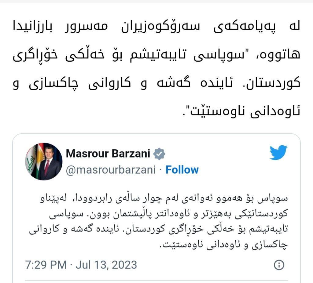 رۆژی (13ـی تەمموزی 2023)، مەسرور بارزانی، سەرۆکی حکومەتی هەرێمی کوردستان لە پەیامێکدا لە تویتەر بڵاویکردەوە، “سوپاس بۆ هەموو ئەوانەی لەم چوار ساڵەی رابردوودا، لەپێناو کوردستانێکی بەهێزتر و ئاوەدانتر پاڵپشتمان بوون”.