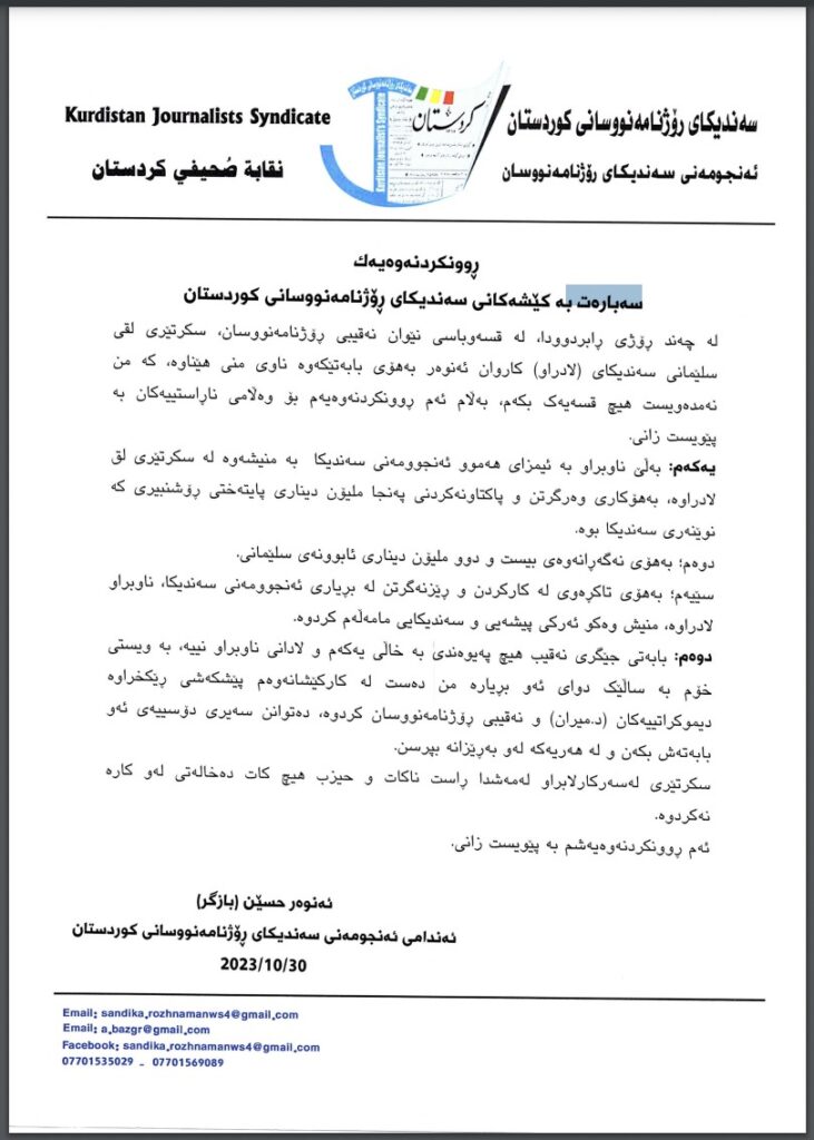 ئەنوەر حسێن (بازگر) ئەندامی سەندیکای رۆژنامەنووسانی کوردستان روونکردنەوەیەکی لەبارەی کێشەکانی سەندیکاکە بڵاوکردەوە.