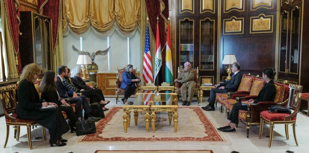 سەرۆك مەسعود بارزانی لە سەلاحەددین پێشوازی لە خاتوو ڤیكتۆریا نولاند جێگری وەزیری دەرەوەی ئەمەریكا بۆ كاروباری سیاسی و شاندێكی یاوەری كرد كە پێكهاتبوو لە خاتوو ئەلینا رومەنسكی باڵیۆزی ئەمەریكا لە عێراق و مارك سترۆ كونسوڵی گشتیی ئەمەریكا لە هەولێر و ژمارەیەك دیپلۆماتكاری ئەمەریكی.
