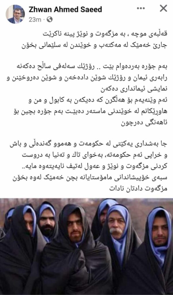 ژوان ئەحمەد کادیرى پێشکەوتووى یەکێتى، لە فەیسبووکى خۆى نوسیوویەتى، قەڵبەی موچە ، بە مزگەوت و نوێژ پینە ناكرێت، جارێ خەمێک لە مەکتەب و خوێندن لە سلێمانی بخۆن، بەم جۆرە بەردەوام بێت.