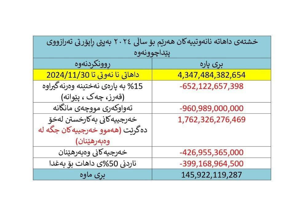 وەزارەتی دارایی و ئابووریی حكوومەتی هەرێمی كوردستان، خشتەی داهاتە نانەوتییەكانی هەرێمی کوردستانى بۆ 2024 بەپێی راپۆرتی تەرازووی پێداچوونەوە بڵاو كردەوە، كە بەپێی خشتەكە لە كۆی داهاتی ناوخۆ 145 ملیار دینار و 922 ملیۆن دینار لە داهاتەكە ماوەتەوە و ئەوانەی تر لە خەرجییەكانی بەكارخستن، وەبەرهێنان و ناردنی %50ی داهات بۆ بەغدا خەرج كراوە.