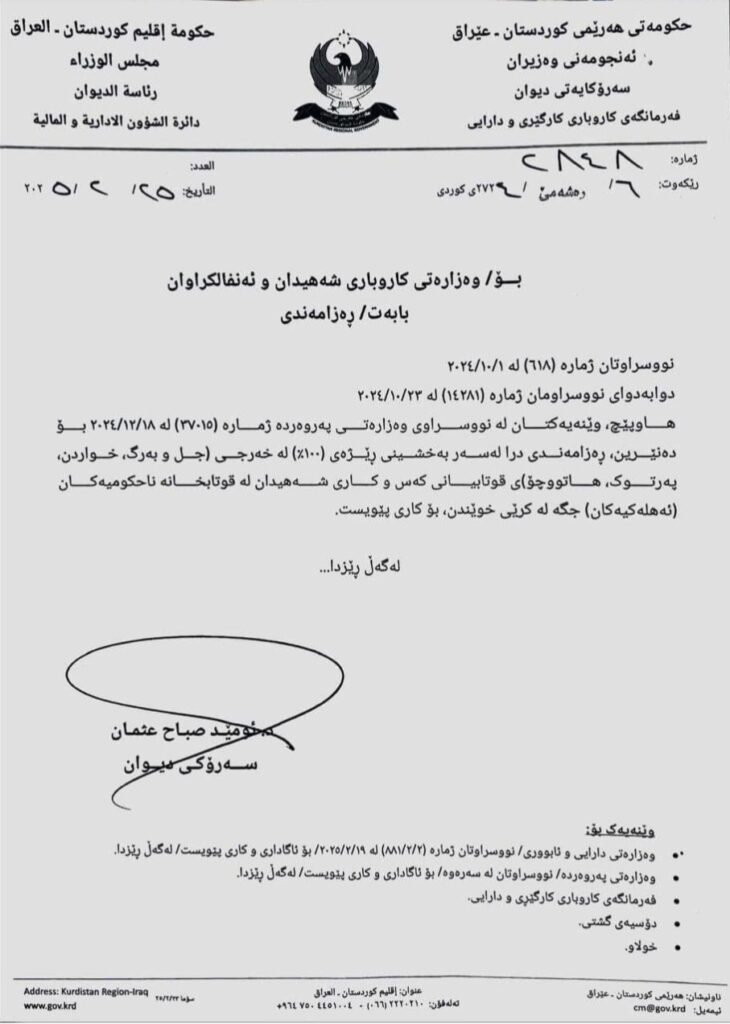 بەگوێرەی نووسراوێكی ئەنجوومەنی وەزیرانی هەرێمی كوردستان كە دوێنێ سێشەممە ئومێد سەباح سەرۆكی دیوان واژۆی لەسەر كردووە و ئاراستەی وەزارەتی كاروباری شەهیدان و ئەنفالكراوان كراوە، بڕیاردراوە بە بەخشینی 100%ی قوتابییانی كەسوكاری شەهیدان لە قوتابخانە ناحكوومییەكان (ئەهلییەكان).