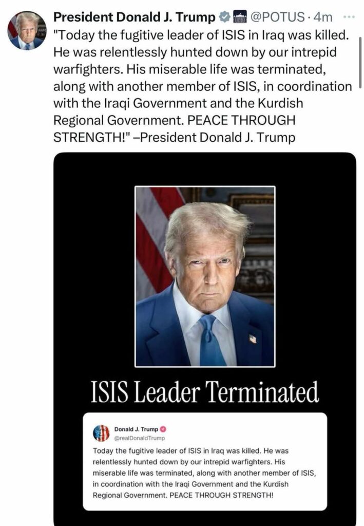 دۆناڵد ترەمپ، سەرۆكی ئەمریكا، لە هەژماری فەرمیی خۆی لە تۆڕی (ئێكس) ئاماژەی بە كوشتنی عەبدوڵا مەكی ڕەفیعی (ئەبوو خەدیجە) كرد.