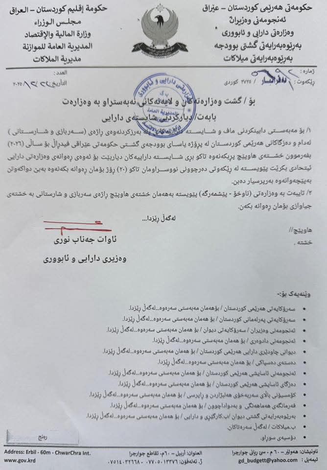 نووسراوەكە ئەمڕۆ دووشەممە رێكەوتی 22/12/2025 بە واژۆی ئاوات شێخ جەناب وەزیری دارایی و ئابووری دەركراوە و ئاراستەی گشت وەزارەتەكان و لایەنەكانی نەبەستراو بە وەزارەتەكان كراوە.