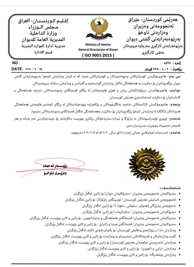 دەقی راگەیهندراوهكهی وەزارەتی ناوخۆ: