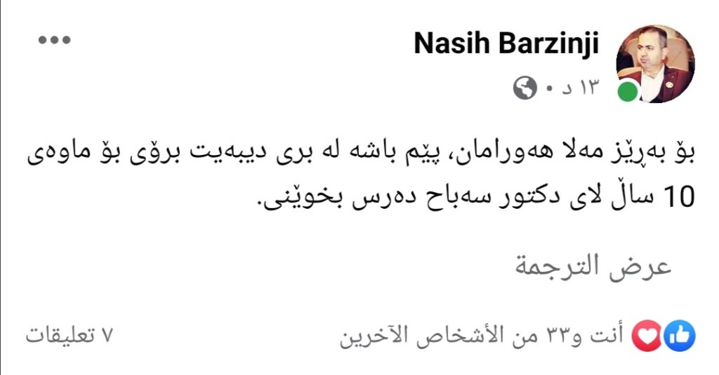 لە بەرامبەردا ناسیح شێخ محەممەد بەرزنجی برای بچوکی دکتۆر سەباح، بۆ مەلا هەورامان دەنوسێت