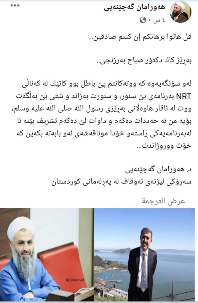 مەلا هەورامان پەرلەمانتار لە فڕاکسیۆنی کۆمەڵی ئیسلامی، هێرشی توندی کردووەتە سەر دکتۆر سەباح بەرزنجی کوڕە گەورەی مەلا شێخ محەممەد بەرزنجی ڕابەری کۆچ کردووی کۆمەڵی ئیسلامی لەسەر بەشداری کردنی لە بەرنامەیەکی تەلەفزیۆنی تایبەت بە تەریقەت و شێخەکان، و داوای ڕووبەڕووبونەوەی تەلەفزیۆنی لێدەکات، دەڵێ سنورت بەزاندووە.