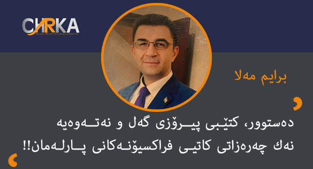 بـــا، لەم رۆژگاری چەواشـەكاریـــیە سیاســـییە بەرفراوانــەی كوردستانماندا، پــرۆژەی دەستوری هەرێمی كوردستان بكــەین بە (مــــــەرج)، بە مـــەرجـــــی سەرەكیـی، بۆ داڕشتنــەوەی شەرەفنامەی دیمۆكراسـی بۆ حزبایـەتیكردن و بۆ (ئاساییــكردنـەوەی پەیوەندیە حزبیــیەكانی ناو هەرێمی كوردستان). پەسەندكردنـی پرۆژەی (دەستوری دیمۆكراسـی گەلی كوردستان)، چ بە ڕێــفێــراندۆمێكی ئازاد چ بە پرۆژیەكی پارلەمانیـی، گارانتیــە بۆ خاوەندارێـتی جیۆگرافیای نیشتمانیـــمان و بۆ بەهێزبوونەوەی دەنگ و پێگـەی گەلی كوردستان لە مێژووی ئایندەدا!