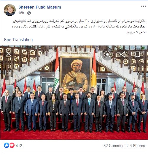 دكتۆری شیرین فواد مهعسووم لهو بارهوه دهنوسێت:ناکرێت حوکمڕانی و گەندەڵی و بندیواری ٣٠ ساڵی رابردوو ئەم ھەرێمە ڕووبەڕووی ئەم کابینەیەی حکومەت بکرێتەوە کە ساڵێکە دامەزراوە و نیوەی ساڵەکەشی بە کێشەی کۆڕۆنا و کێشەی ئابووریەوە خەریک بووە.