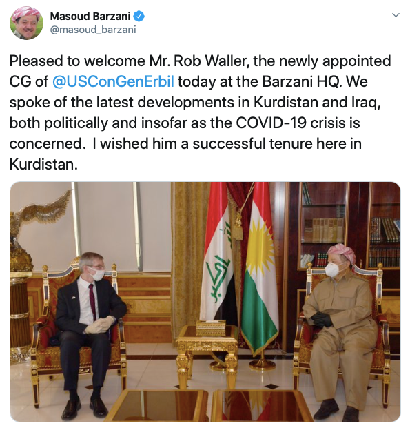 سەرۆک بارزانی نووسیویە: “خۆشحاڵ بووم ئەمڕۆ لە بارەگای بارزانی پێشوازیم کرد لە بەڕێز ڕۆب واڵەر، کۆنسوڵی گشتیی نوێی ویلایەتە یەکگرتووەکانی ئەمریکا لە هەولێر.”