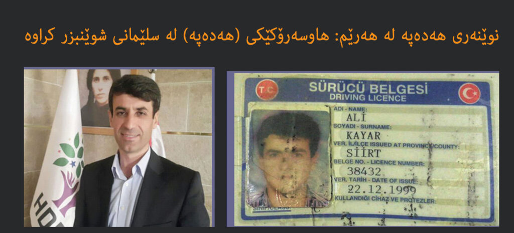 ماوەی دوو هەفتەیە (عەلی قایار) هاوسەرۆكی پارتی دیموکراتی گەلان (هەدەپە)ی شاری سێرت، لە سلێمانی دیار نەماوەو نوێنەری هەدەپە لە هەرێمی كوردستان گومانی هەیە لە لایەن “میت”ی توركیەوە رفێنرابێت یان لەلایەن ھێزەكانی ناوچەكەوە ڕادەستی توركیا كرابێت.