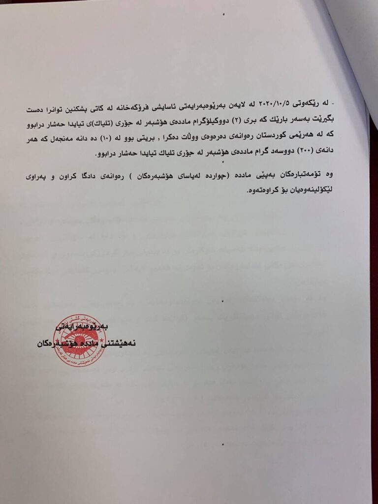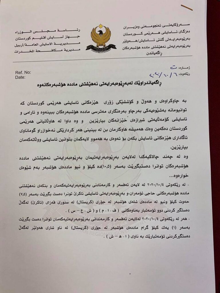 ئهمڕۆ سێشهممه بهڕێوهبهرایهتی نههێشتنی مادده هۆشبهرهكانی ههولێر ڕاگهێندراوێكی بڵاوكردهوهو ڕایگهیاند: له ماوهی چهند ڕۆژی ڕابردوودا هێزهكانمان توانیویانه دهست بهسهر چهند كیلۆگرام ماددهی هۆشبهردا بگرن.