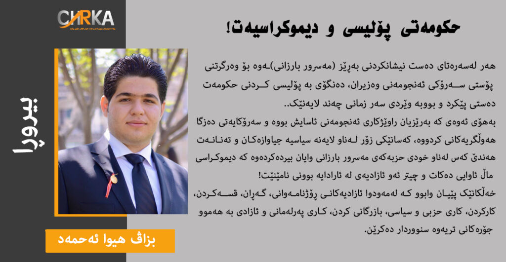 ھەر لەسەرەتای دەست نیشانکردنی بەڕێز (مەسرور بارزانی)ـەوە بۆ وەرگرتنی پۆستی سەرۆکی ئەنجومەنی وەزیران، دەنگۆی بە پۆلیسی کردنی حکومەت دەستی پێکرد و بووبە وێردی سەر زمانی چەند لایەنێک.