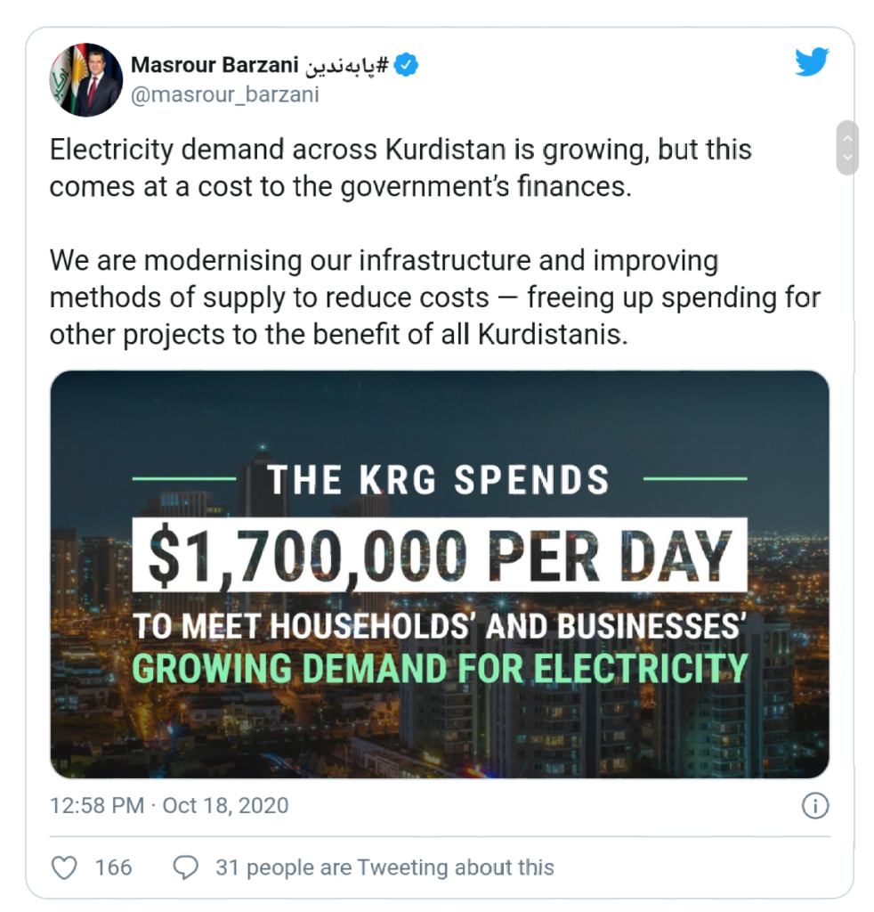مەسرور بارزانی، سەرۆکی حکومەتی هەرێمی کوردستان ئەمڕۆ (یەکشەممە، 18-10-2020) لە رێگەی تویتێکەوە لە تویتەری فەرمیی خۆی رایگەیاند “پێویستیی بۆ کارەبا لە هەموو هەرێمی کوردستان لەزیادبووندایە، کە ئەمەش ئەرکی ئابووریی لەسەر حکومەت زیاد کردووە”.