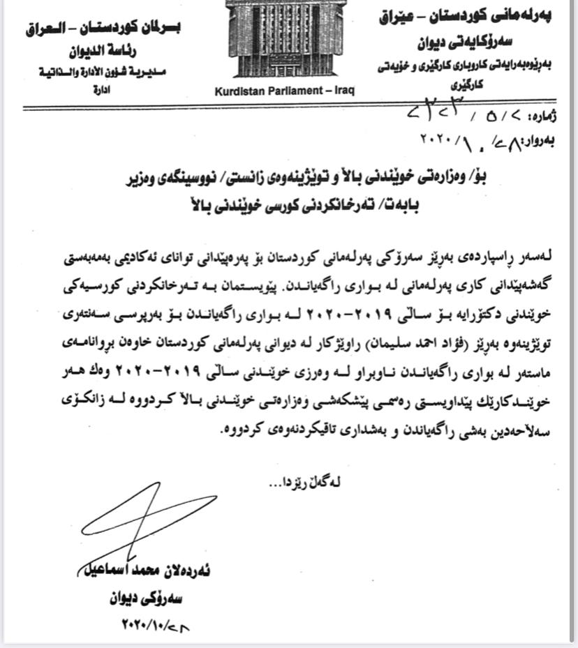 بهپێ ئهو نوسراوهی بهردهستی ماڵپهڕی چركه كهوتووه، سهرۆكایهتی دیوانی پهرلهمانی كوردستان نوسراوێكی ئاڕاستهی وهزارهتی خوێندنی باڵا و توێژینهوهی زانستی كردووه، داوا دهكات ڕاوێژكارێكی بهناوی(فواد ئهحمهد سلێمان)به قبوڵخاس له زانكۆ وهربگیردرێت بۆ خوێندنی دكتۆرا.