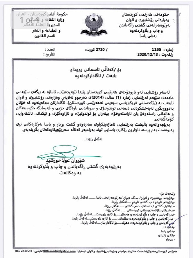به‌رێوه‌به‌رایه‌تی گشتی راگه‌یاندن و چاپ و ئاماژه‌ بۆ ئه‌وه‌ش ده‌كات ‌،به‌پێچه‌وانه‌وه‌ پاڵپشت به‌ڕێنماییه‌كان گشت بڕیار و یاسا به‌ركاره‌كانی تری په‌یوه‌ست به‌م پرسه‌، ئه‌وا ناچارین ڕێكاری یاسایی توند به‌رامبه‌ر به‌كه‌ناڵه‌كانتان بگرینه‌به‌ر.