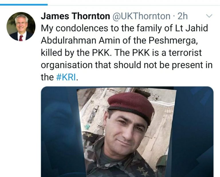 جێمس تۆرنتۆ، سهركونسوڵی بهریتانیا له ههولێر، له راگهیهندراوێكدا له رێگهی تویتهر، سهرهخۆشهی له خانهوادهی ئهو پێشمهرگانه كرد كه له ئهنجامی پێكدادانێكدا لهگهڵ پهكهكه گیانیان لهدهستدابوو.