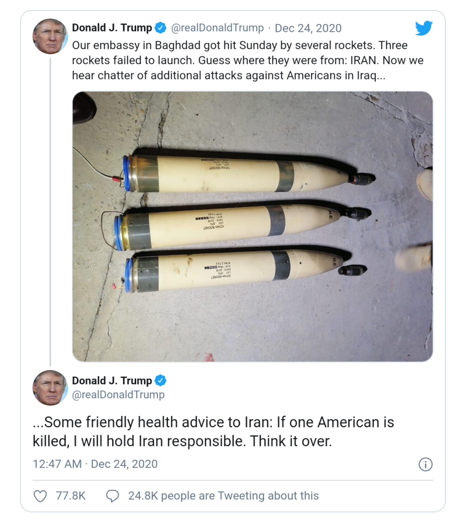 دۆناڵد ترەمپ، سەرۆکی ئەمریکا لە تویتێکدا لەبارەی هێرشەکەوە ئاماژەی بەوە کردووە، “رۆژی شەممە باڵیۆزخانەکەمان لە بەغدا بە چەند مووشەکێک کرایە ئامانج، سێ لەو مووشەکانەش بەرپەرچدرانەوە”. ترەمپ دەشڵێت، مووشەکەکان لەلایەن ئێرانەوە هاوێژراون.