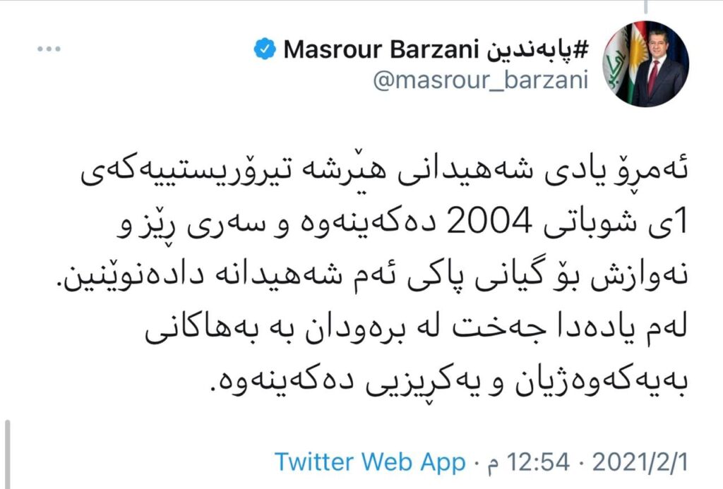 17 ساڵ لهمهوبهر و له 1ی شوباتی 2004، له ههریهك له بارهگاكانی لقی 2ی پارتی دیموكراتی كوردستان و مهڵبهندی 3ی یهكێتی نیشتمانی كوردستان، لهكاتی پێشوازیكردن له میوانان بۆ جهژنه پیرۆزه، دوو تهقینهوه ههردوو بارهگای لقی دووی پارتی دیموكراتی كوردستان و مهڵبهندی سێی یهكێتی نیشتیمانی كوردستان بهئامانج گرت ، بههۆیهوه چهندین سهركرده و كادر و هاووڵاتی لهههردوو پارتدا شههید و برینداربوون ، لهم یادهشدا مهسرور بارزانی سهرۆكی حكومهتی ههرێمی كوردستان لهههژماری تایبهت بهخۆی لهتویتهر پهیامێكی بڵاو كردهوه و رایدهگهێنێت: