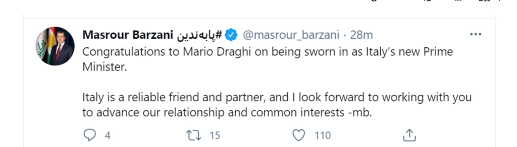 سەرۆکی حکومەتی هەرێمی کوردستان لە توتێکدا نووسیویەتی: “بەبۆنەی سوێندخواردنی وەک سەرۆک وەزیرنی نوێی ئیتاڵیا، پیرۆزبایی لە “ماریۆ دراگی” دەکەم”.