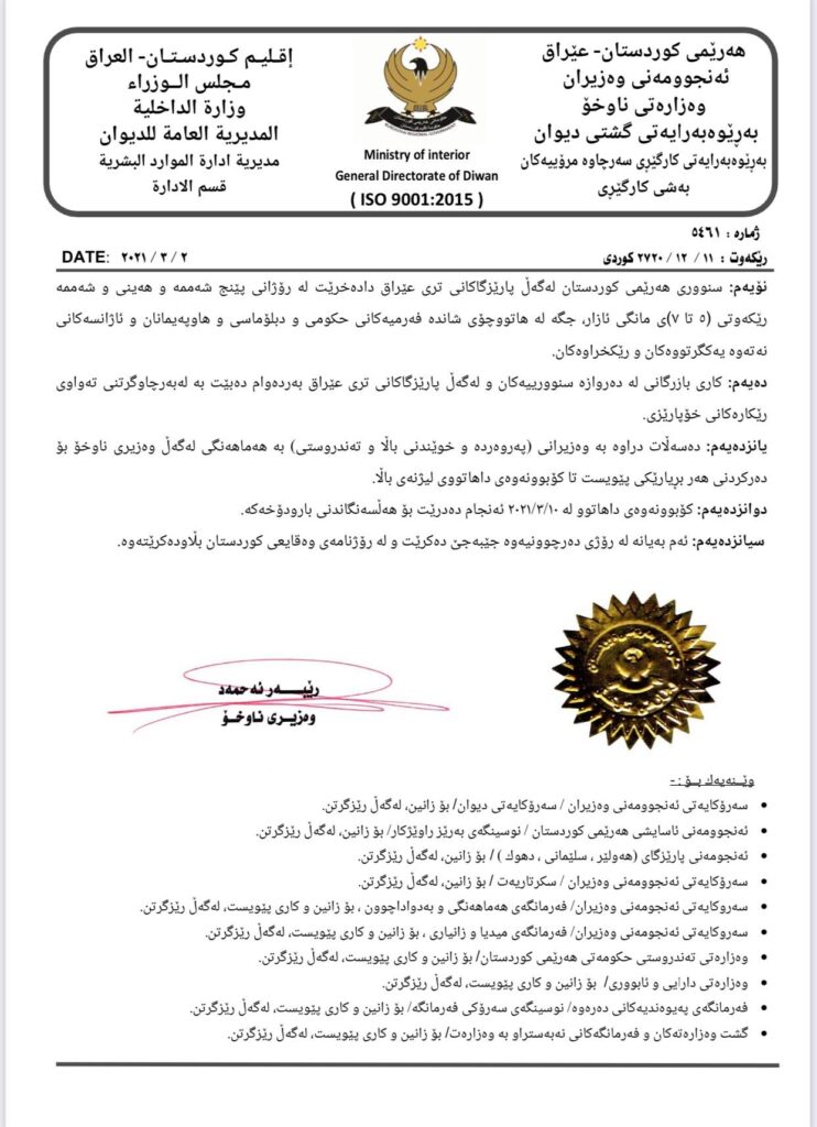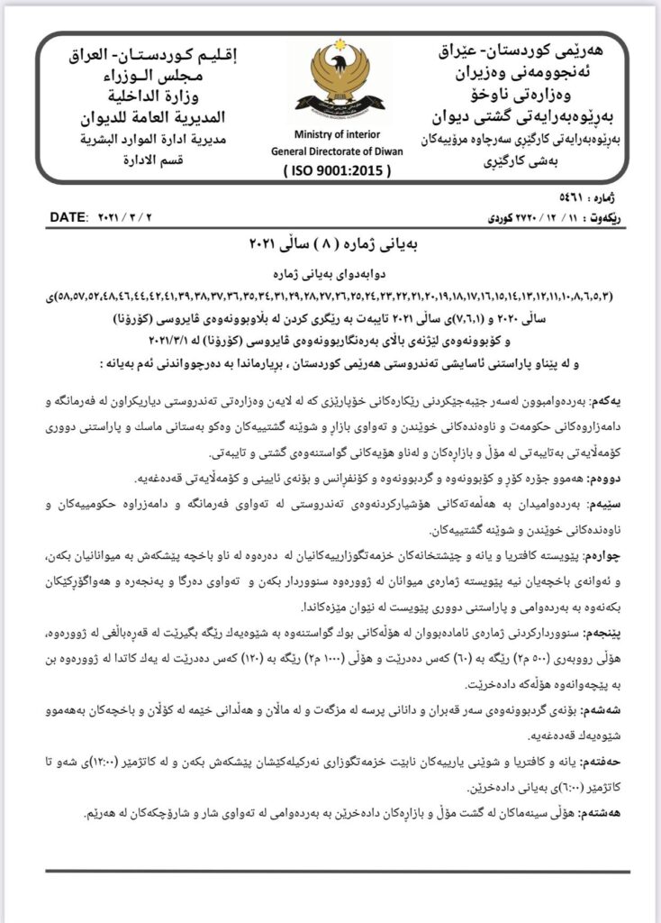 ئهمڕۆ سێشهممه 2/3/2021، وهزارهتى ناوخۆ بهیاننامهیهكى بڵاو كردهوه و وێنهیهكى دهست (باسنیوز) كهوتووه، تێیدا باس لهوه كراوه، له كۆبوونهوهى دوێنێى لێژنهى باڵاى ڕووبهڕووبوونهوهى كۆرۆنا، لهپێناو پارستنى ئاسایشى تهندروستى، چهند بڕیارێكیان دهركردووه.