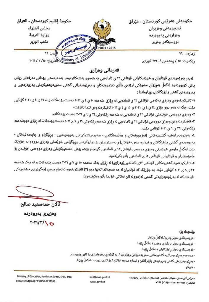 هەر بەپێی بڕیارەکەی وەزارەتی پەروەردەی هەرێم تاقیکردنەوەی وەرزی دووەمی قۆناغی ١٢ی ئامادەیی لە رۆژی شەممە ١٩ی٦ی٢٠٢١ دەستپێدەکات و لە رۆژی دووشەممە ٢٨ی٦ی٢٠٢١ کۆتایی دێت.