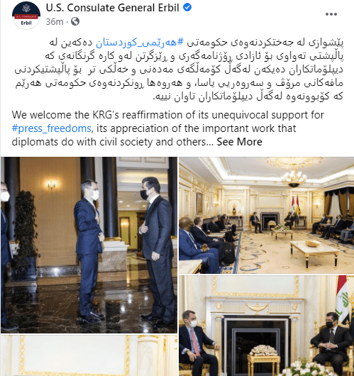 كونسوڵخانهی ئهمهریكا له شاری ههولێر، له هەژماری خۆیدا لە تۆڕی كۆمهڵایهتیی (فهیسبووك) پێشوازی له هەڵوێستی سەرۆكی حكوومەتی هەرێمی كوردستان و پشتیوانی حكوومهتی ههرێمی كوردستان له ئازادی رۆژنامهوانی و رێزگرتن له كاری دیپلۆماتكاران كرد.