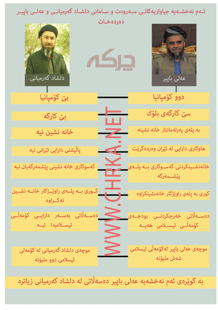 جیاوازی دڵشاد گەرمیانی و عەلی باپیر لەڕوی سەروەت و سامانیان, لەم نەخشەیە بەتەواوی دەردەخەین, هەر بەپێی ئەوزانیارییانەی كە دەست چركە كەوتوون عەلی باپیر زۆربەی كەسوكاری خۆی بە پلەی بەرزی پێشمەرگایەتی خانەنشین كردوون لەسەر وەزارەتی پێشمەرگە, جگە لەمە زۆربەی كات عەلی باپیر هاوكاریی دارایی لە كۆماری ئیسلامی ئێران وەرگرتووە, هەروەها ئەوەش ناشاردرێتەوە كە یەكێتی سەردەمانێك پارە و خەرجی كۆمەڵی سەرفدەكرد و چەندین جار لەلایەن خوددی تاڵەبانی پارە بە عەلی باپیر دراوە, بەڵام لەوكاتەی دڵشاد گەرمیانی پەیوەندی بە  بزووتنەوەی ئیسلامییەوە كردووە بووەتە زەرەر بۆ خۆی و بنەماڵەكەی و كەسە نزیكەكانی, سەرچاوەیەك لە بنەماڵەی دڵشاد گەرمیانییەوە بە چركەی راگەیاند لەكاتی شەڕی ناوخۆ لە نێوان بزووتنەوەی ئیسلامی و یەكێتی سەری هەڵدا زۆربەی سەروەت و سامانی ئەو بنەماڵەیە تاڵانكرا, هەروەها دڵشاد گەرمیانی لە شەڕی نێوان كۆمەڵ و بزووتنەوەی ئیسلامی لە خورماڵ برایەكی شەهید كرا, ئەمەش ئەوە دەردەخات كە دڵشاد گەرمیانی زیاتر قوربانی بۆ حزبەكەیان داوە, بەڵام عەلی باپیر زیاتر سوودی بینیوە.