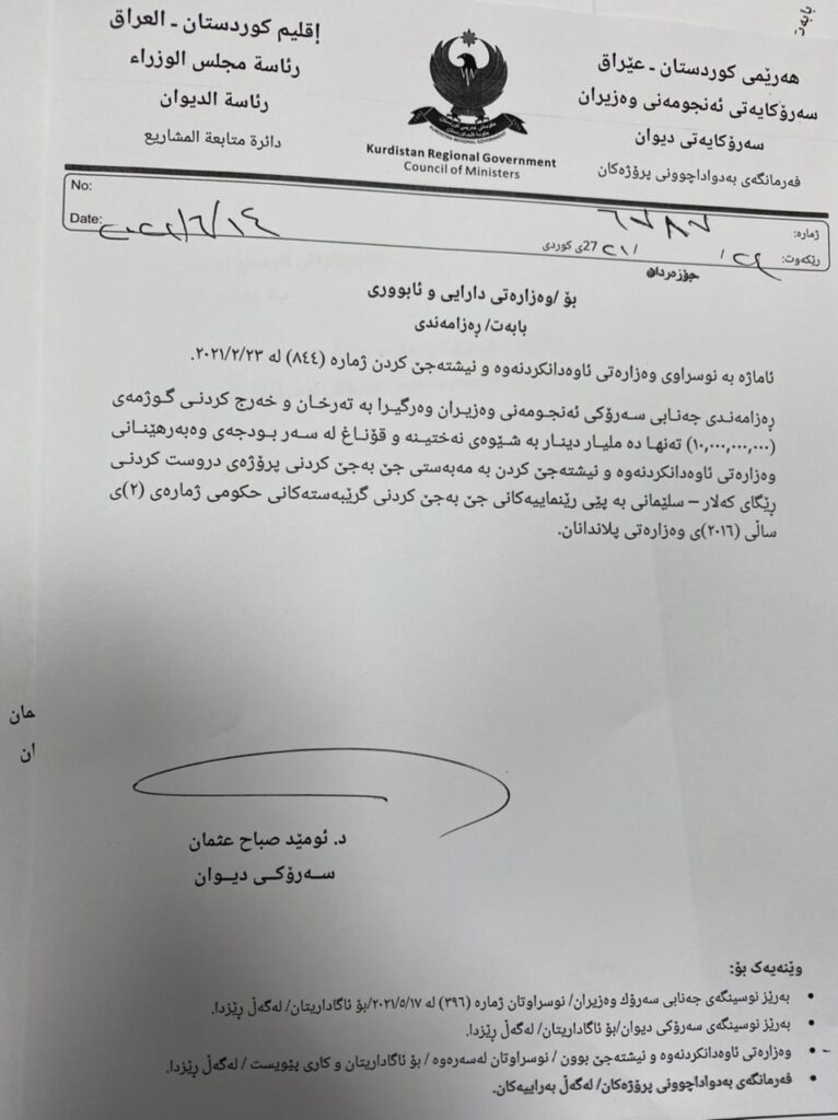 بهپێی نووسراوێكی فهرمانگهی بهدواداچوونی پڕۆژهكان له سهرۆكایهتی ئهنجومهنی وهزیران، مەسرور بارزانی، سەرۆکی حکوومەتی هەرێمی کوردستان رەزامەندیی لەسەر تەرخانکردنی ئەو بڕە پارەیە، داوە.