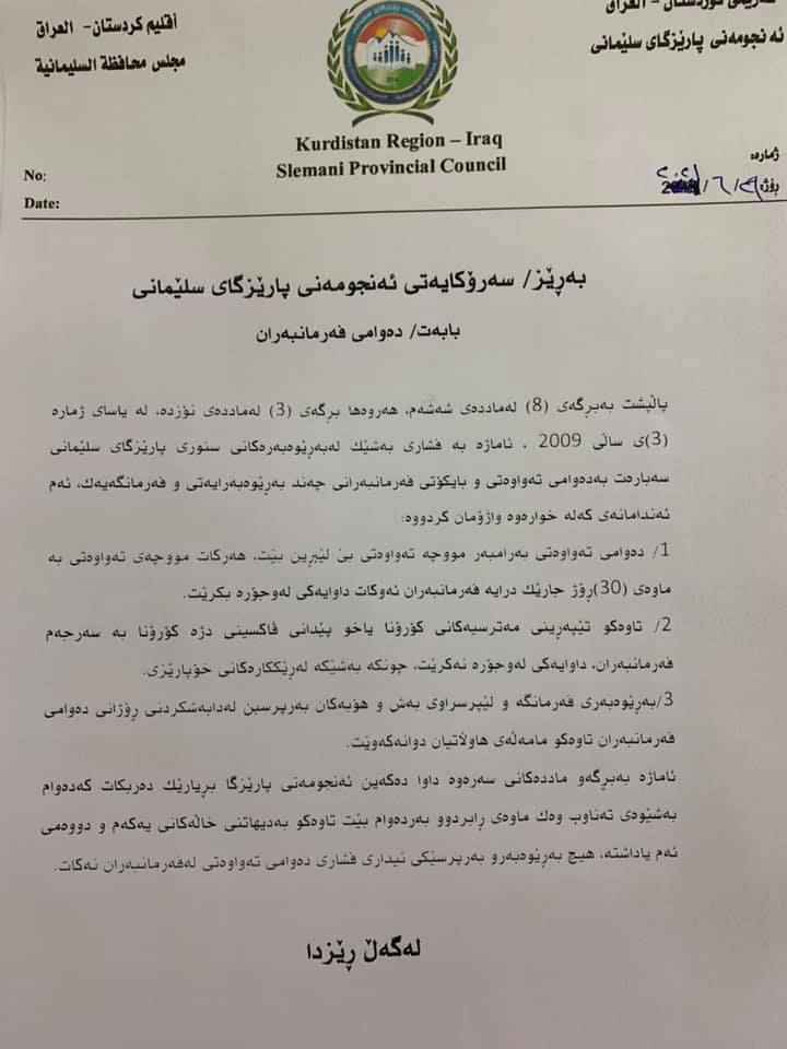 ژمارهیهك له ئهندامانی ئهنجوومهنی پارێزگای سلێمانی له ڕێی بڵاوكردنهوهی یاداشتێكهوه وا له فهرمانبهرانی سنووری سلێمانی دهكهن كه دهوام نهكهن و خۆیشیان نایشارنهوه كه ئهو داواكارییهیان ههیه.